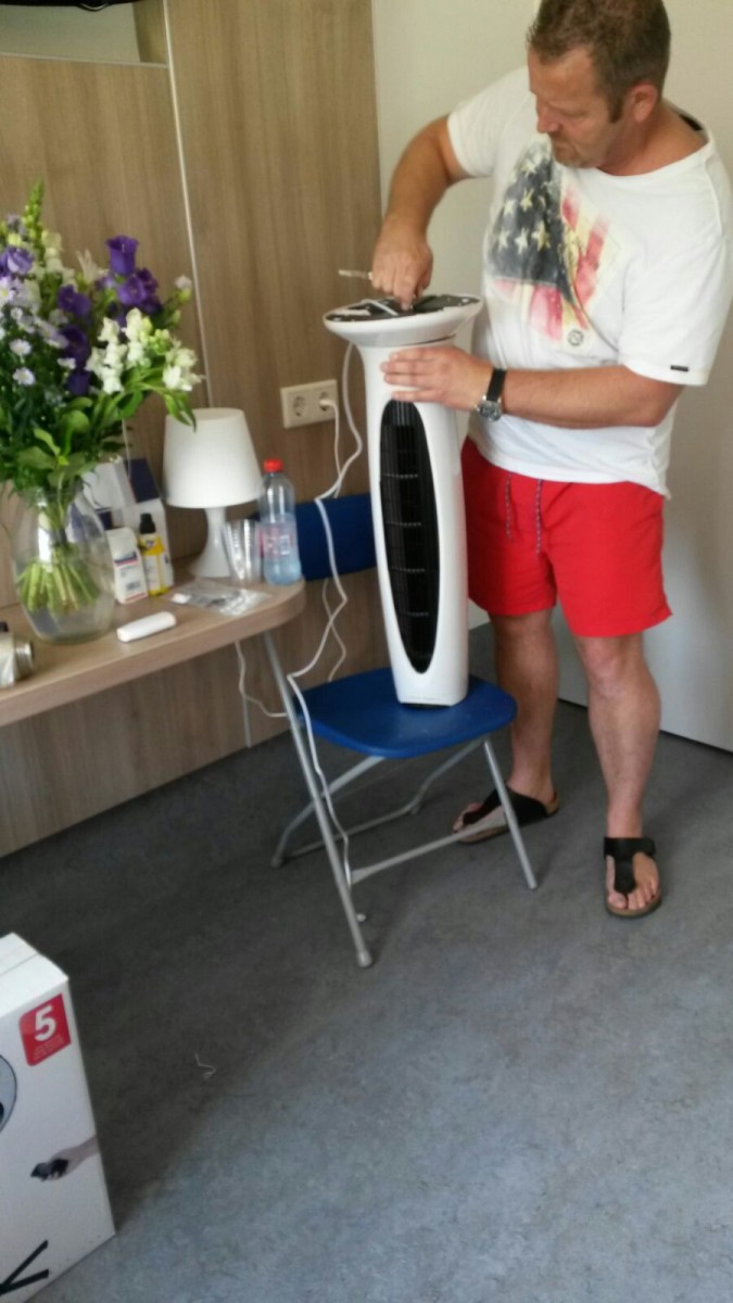 Ada is natuurlijk weer als eerste binnen en is vanmorgen al op pad geweest voor een ventilator… Nu ben je met deze temperaturen niet de enige en ze heeft er wel een, maar is veel te groot voor deze kamer. Dus… even kijken of ik de visite kan strikken om nog ergens een andere te scoren.